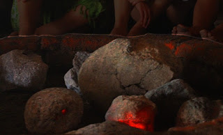 Luis from outside places one by one the stones in the entrance and I have to catch them by making a clamp with two wooden tools in the shape of slingshots of the size of 2 palms. With the grandmother in the tweezers I have to place her in a ritual order from the center of the temazcal to the different cardinal points, elements, paths.